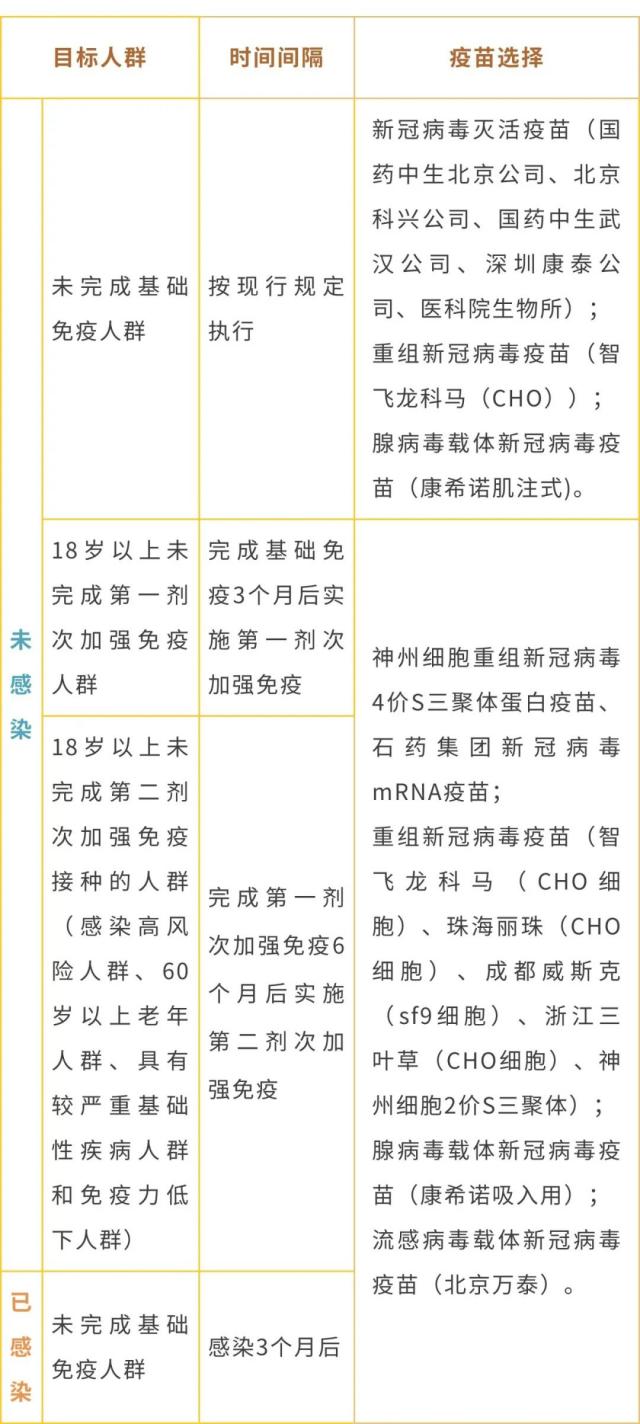 未感染目标人群基础免疫接种使用的疫苗,参照前期有关要求执行,加强免疫优先推荐使用神州细胞重组新冠病毒4价S三聚体蛋白疫苗、石药集团新冠病毒mRNA疫苗接种,也可选择其他已获批附条件上市或纳入紧急使用的重组蛋白疫苗或病毒载体疫苗进行序贯加强免疫接种。