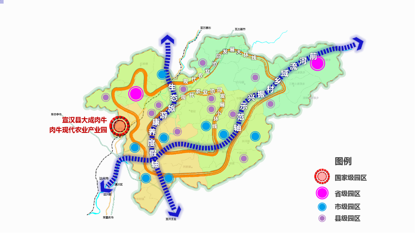 现代农业协同发展小环线——以东乡街道、清溪镇、桃花镇、峰城镇、南坪镇、黄金镇、普光镇之间的主要道路作为连接通道,重点辐射3个市级园区和N个县级园区。
