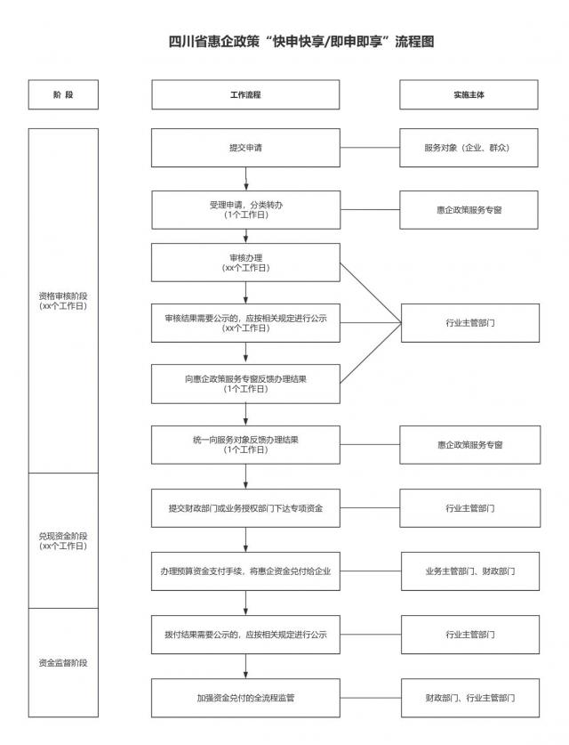2. 快申快享。对符合资格的奖补类等简易类政策兑现事项,实行“快申快享”。由各主管部门制定详细办事指南并公开发布,企业按办事指南向专窗或平台申请,各主管部门在规定时限内审批,提出兑付意见(包括企业名单、兑付金额等),并推送至县政务服务大厅惠企专窗,惠企专窗受理后发起兑付流程,兑付至企业。