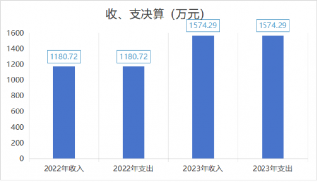 2023年度收、支总计均为1,574.29万元。与2022年度相比,收、支总计各增加393.57万元,增长33.3%。主要变动原因是人员增加,基础设施投资增多。