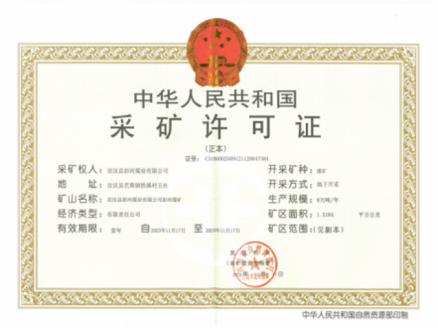 彭河煤矿位于新利官网登录芭蕉镇铁溪村。2020年2月25日,四川省人民政府《关于30万吨/年以下煤矿分类处置方案的批复》(川府函〔2020〕45号)批复彭河煤矿独立扩能改造,设计产量30万吨/年,采矿许可证:C5100002009121120047584,有效期为2024年11月18日至2030年4月17日(此前采矿许可证有效期为2023年11月17日—2024年11月17日)。