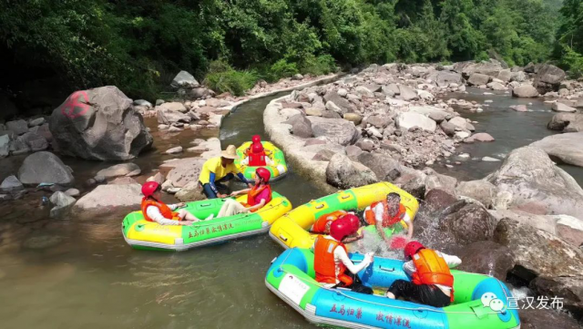 月亮坪漂流全长5公里,漂流地段群山环抱,层峦叠嶂,沟壑纵横,总落差约300米,最高落差8米,漂流时长可达90分钟,开漂期可持续到9月。清凉过夏日,漂流展激情。位于毛坝镇的“月亮坪”漂流,以航道长、弯道多、落差大等特点,吸引了不少游客前去体验漂流的惊险刺激。伴随着声声尖叫,一艘艘漂流艇如利箭般飞驰而下,河道九曲十拐,跌宕起伏,游客们与“浪”共舞,感受惊险刺激,乐享夏日清凉。