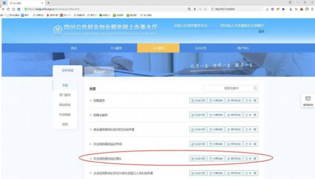 全省符合失业保险稳岗返还的名单已生成,经办人登录四川公共就业创业服务网(网址 http://103.203.218.134)在“ 法人服务 ”的“失业保险稳岗返还确认 ”模块中,对单位基本信息、返还金额、对公账户、联系人及电话等信息进行确认。